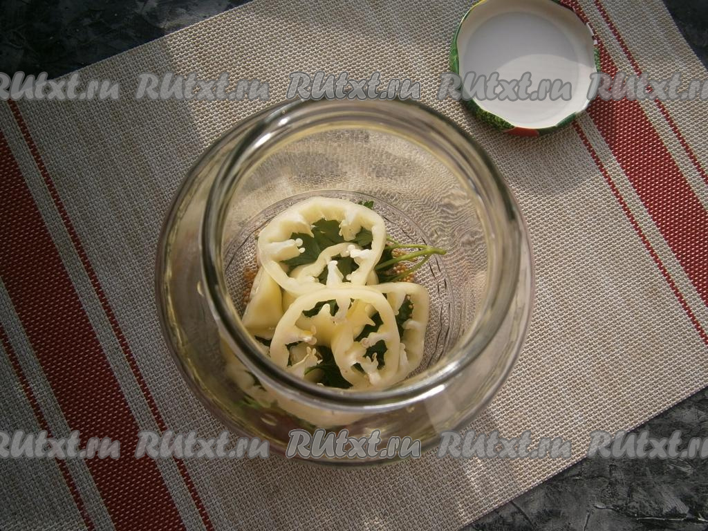 Овощи вымыть. Из перца удалить семена, оставив его целым, и нарезать кружочками (не слишком тонкими). Далее в банку укладывать овощи слоями: вначале кружки болгарского перца.