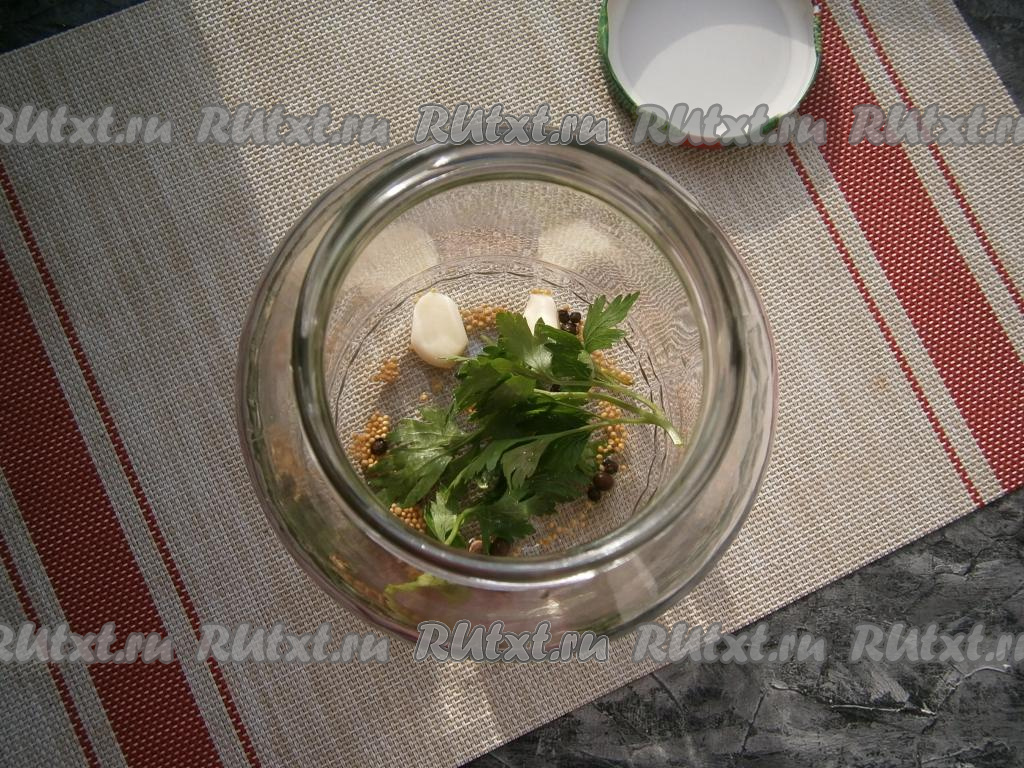 В чистую сухую банку поместить очищенные зубчики чеснока, сухие зёрна горчицы, веточки петрушки, горошинки чёрного и душистого перцев.