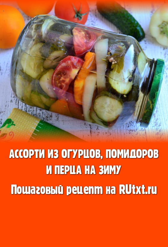 Этот рецепт приготовления на зиму ассорти из огурцов, помидоров и перца мне дала одна знакомая, уверяя, что консервация очень вкусная. Хочу предложить её и вам, так как сам маринад мне понравился, значит и овощи должны быть отменными. Заинтересовал меня рецепт тем, что пропариваются овощи не водой, а готовым маринадом без уксуса, а уксус вливается уже непосредственно перед закаткой в банку. Такая заготовочка, уверена, в зимнее время порадует вас своим отменным вкусом. Расчёт продуктов дан на одну 1,5-литровую банку.