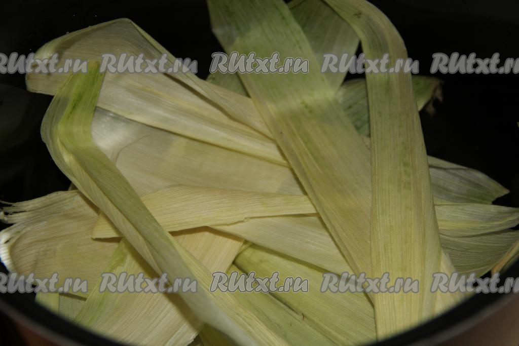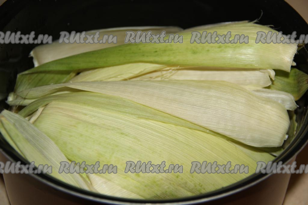 Початки кукурузы очистить от листьев. Часть листьев выложить на дно мультиварки (можно, конечно, готовить и без листьев, но с ними кукуруза получается особенно нежной и ароматной).