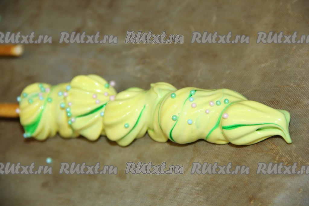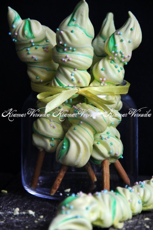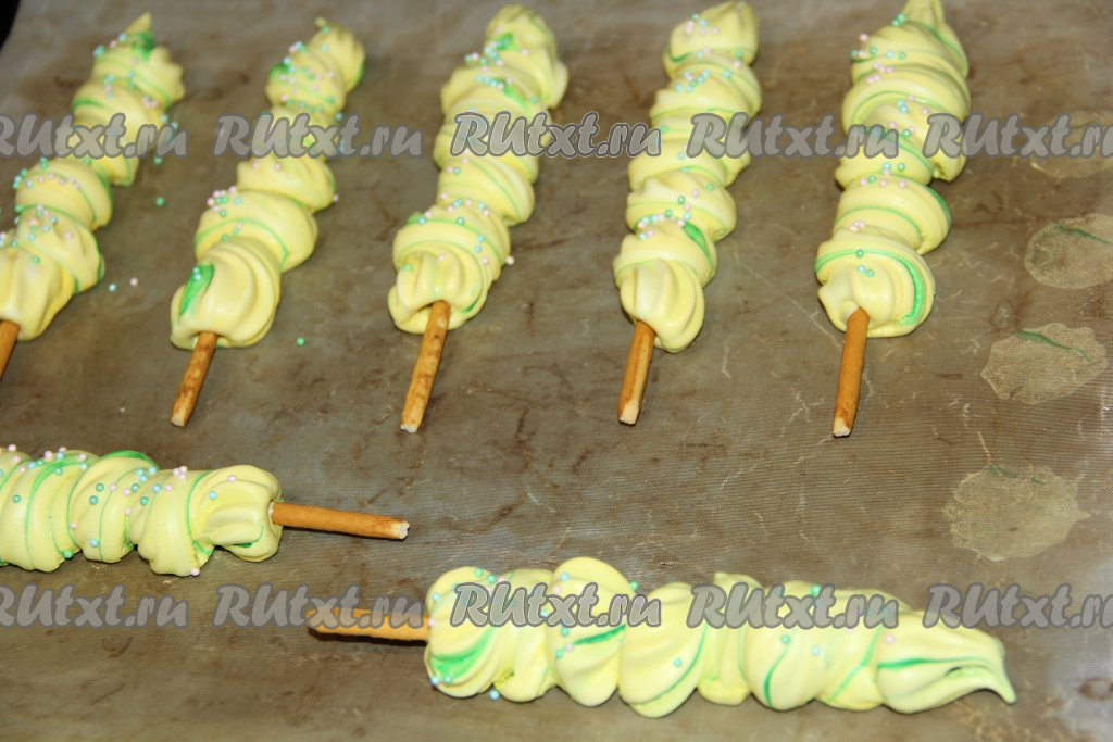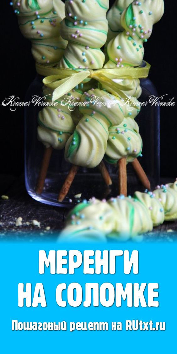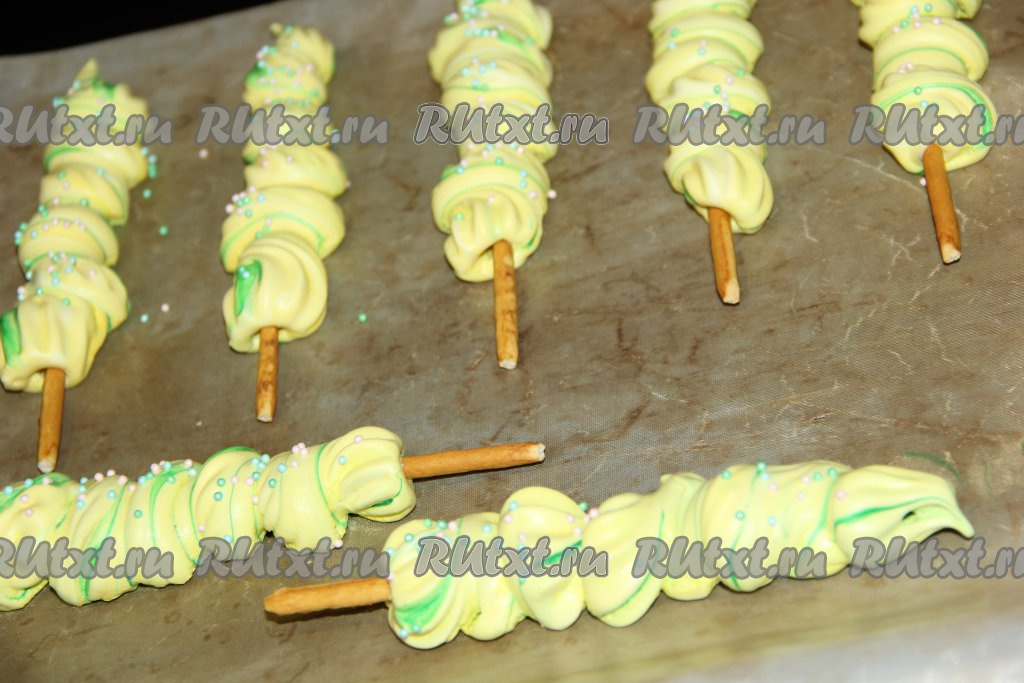 Противень застелить пергаментом (или тефлоновым ковриком для выпекания), выложить меренги на соломке. Можно присыпать кондитерской посыпкой.
