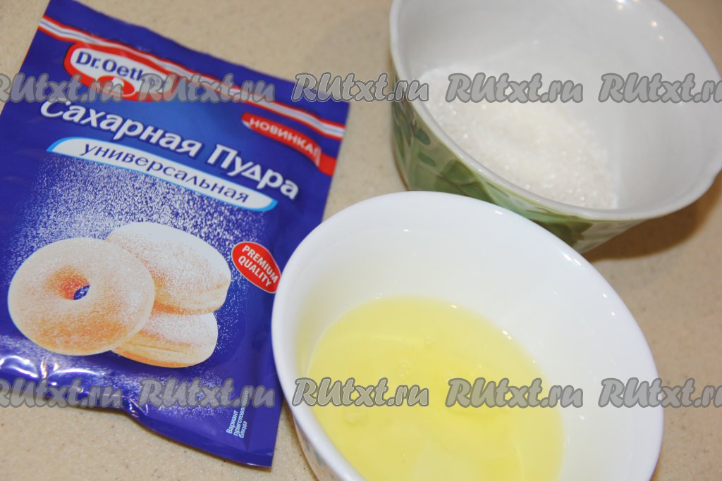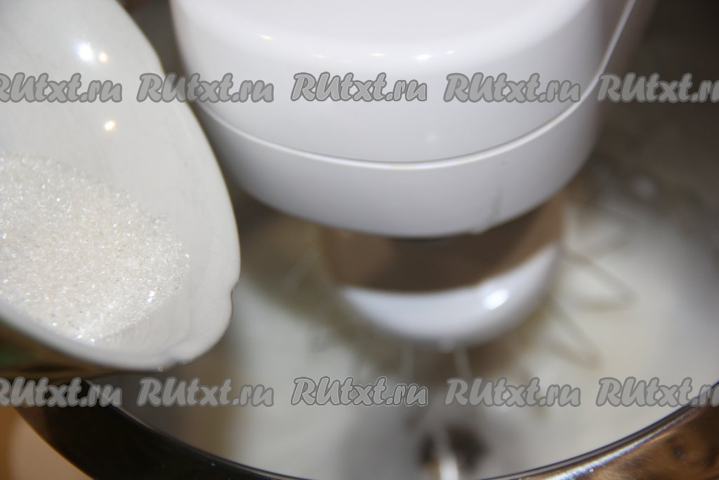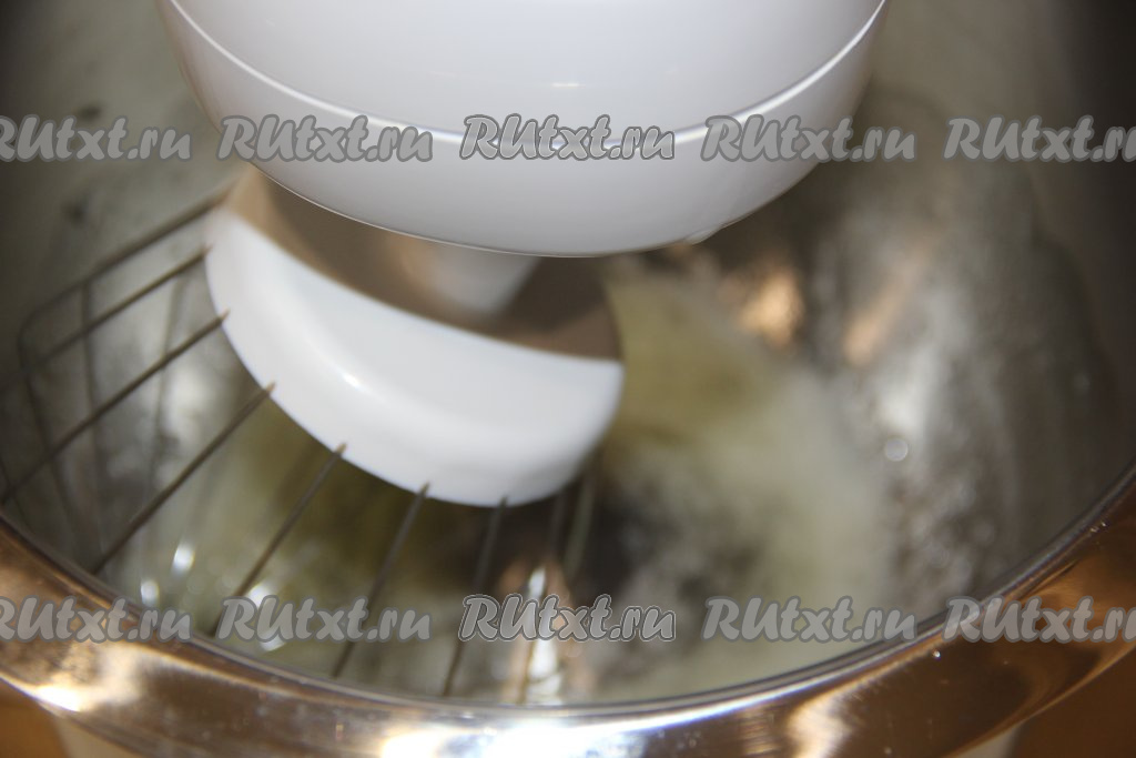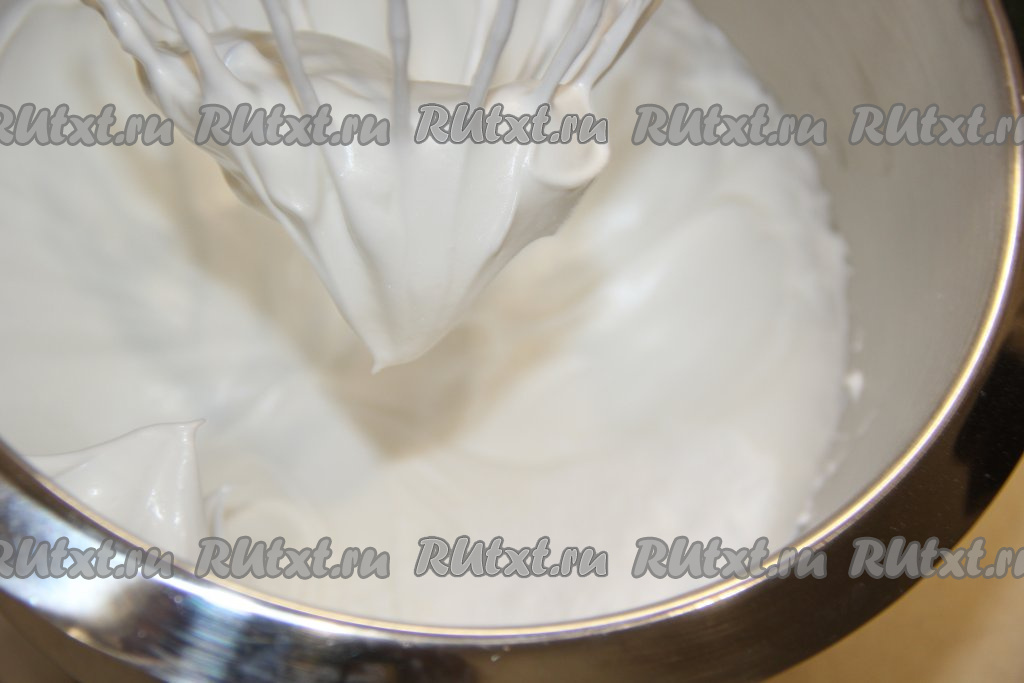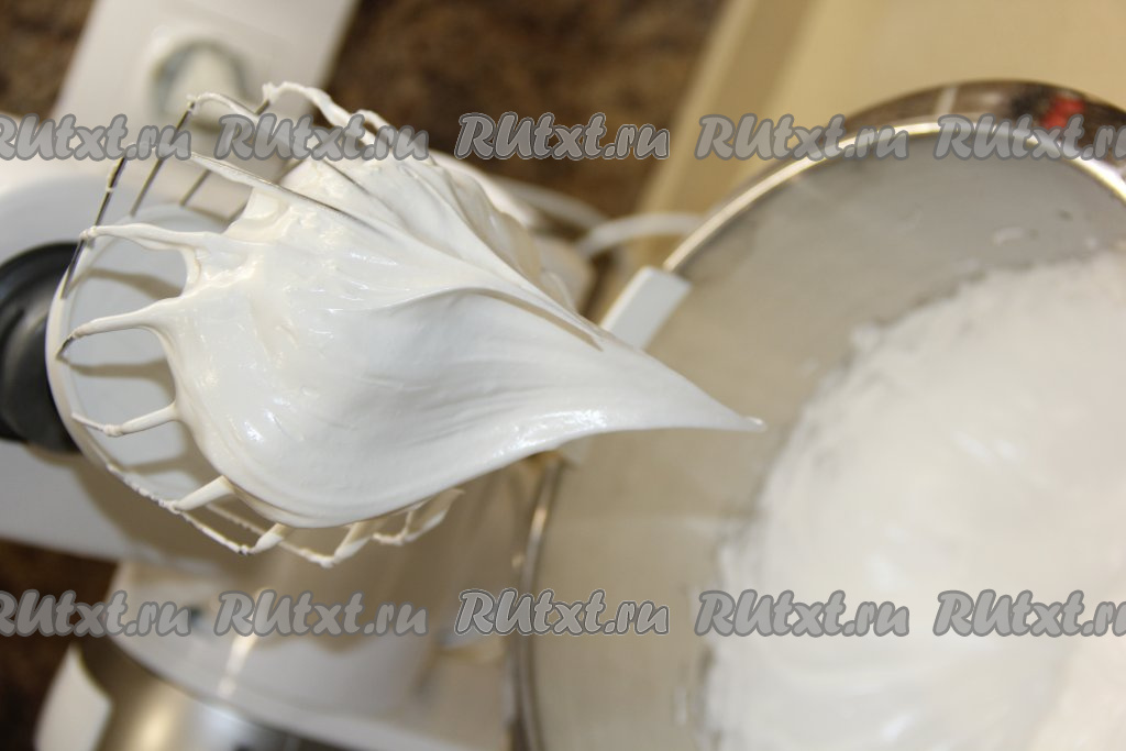 Взбивать белки до стойких пиков и полного растворения сахара (примерно, 8 минут). Как только белки взобьются, добавить сахарную пудру и взбивать 2 минуты.
