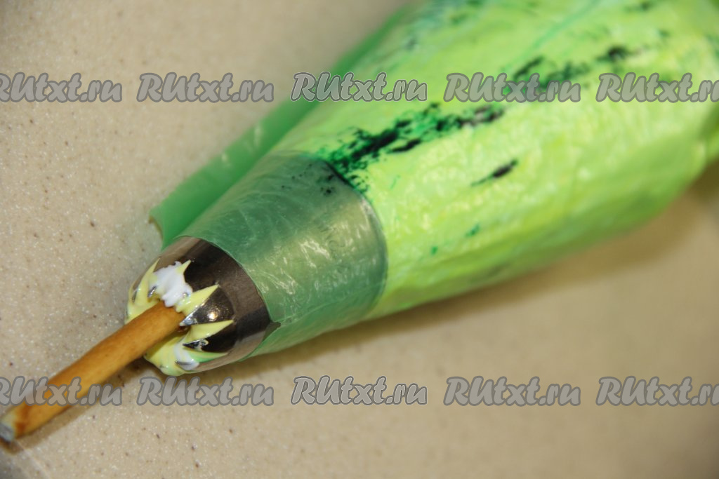 Соломку вставить в отверстие насадки и продавить в белковую массу, оставив небольшой кончик соломки.