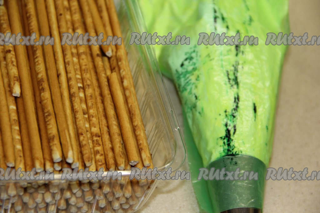 Выложить белковую массу в кулинарный мешок с фигурной насадкой, в которую влезет сладкая соломка. Чтобы сделать меренгу с яркими полосками можно прямо внутрь кулинарного мешка с помощью кисточки или шпажки добавить краситель любого цвета (я добавила каплю зелёного гелевого красителя).