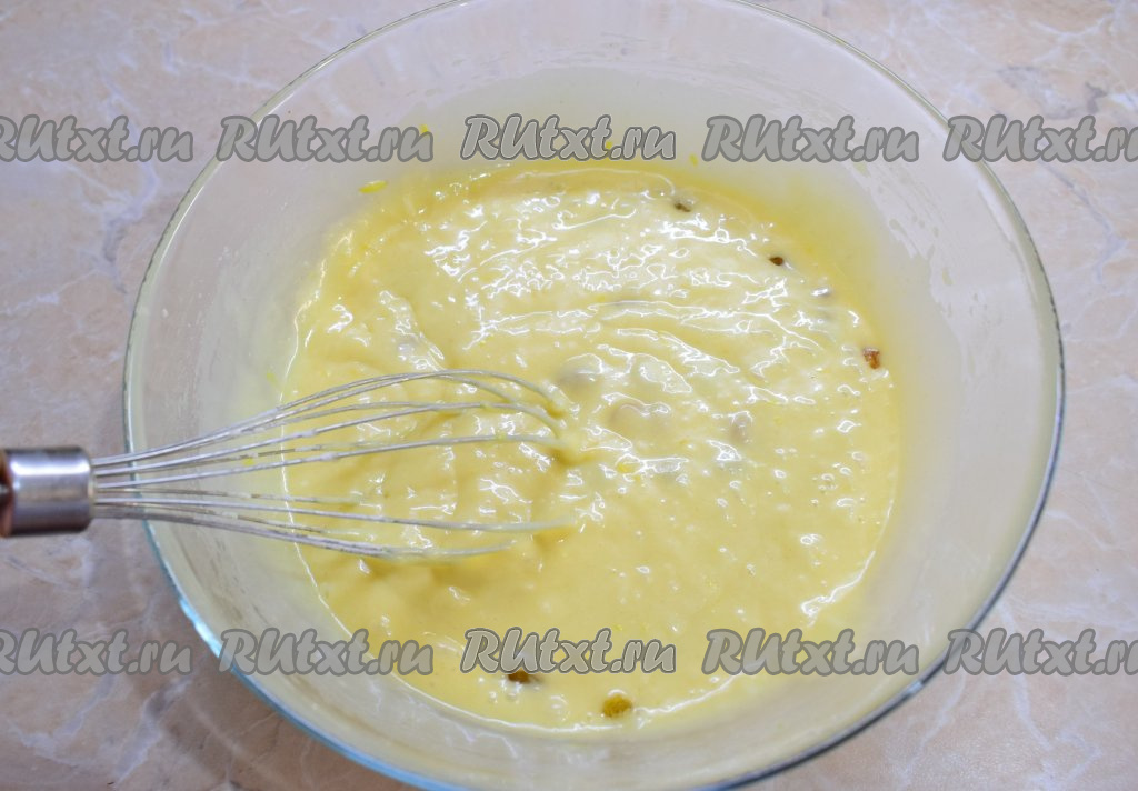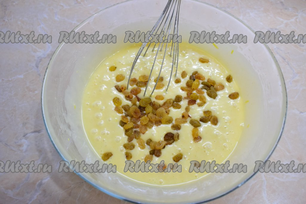 Горсть изюма обдайте кипятком, затем обсушите. Всыпьте изюм в лимонное тесто.