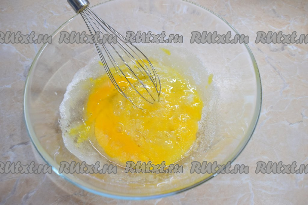 Для приготовления лимонного кекса соедините яйца с сахаром в достаточно глубокой миске и немного взбейте их. Сильно взбивать не надо, достаточно лишь, чтобы ингредиенты хорошо смешались друг с другом. Для смешивания ингредиентов можно воспользоваться венчиком (или миксером).