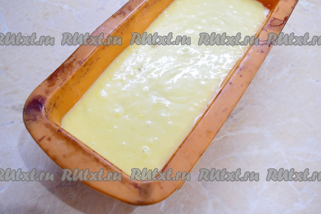 Форму для кекса (у меня размер формы 30 см х 15 см х 8 см) смажьте немного растительным маслом и перелейте в неё лимонное тесто. Поставьте форму в духовку, предварительно разогретую до 180 градусов, на 40-50 минут (продолжительность выпечки зависит от размера формы и особенностей вашей духовки).