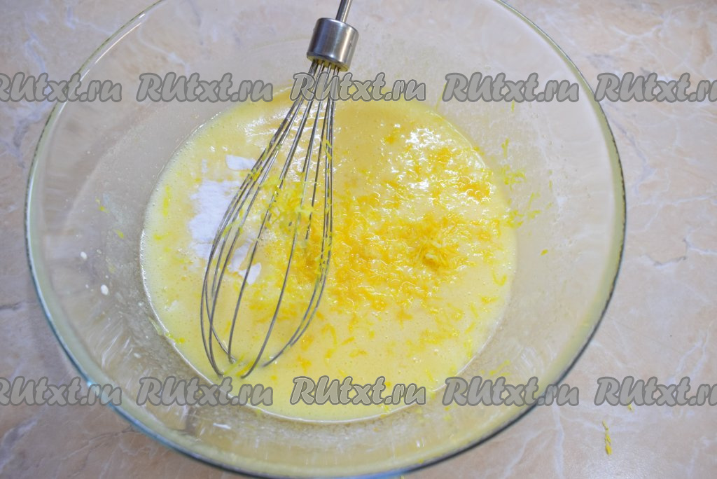 Лимон помойте, обсушите и снимите с него цедру (это удобно делать самой мелкой тёркой). Снимайте лишь жёлтую часть лимона, стараясь не затрагивать белую (наличие белой части лимона придаст горечь). Вмешайте в тесто лимонную цедру и соду.