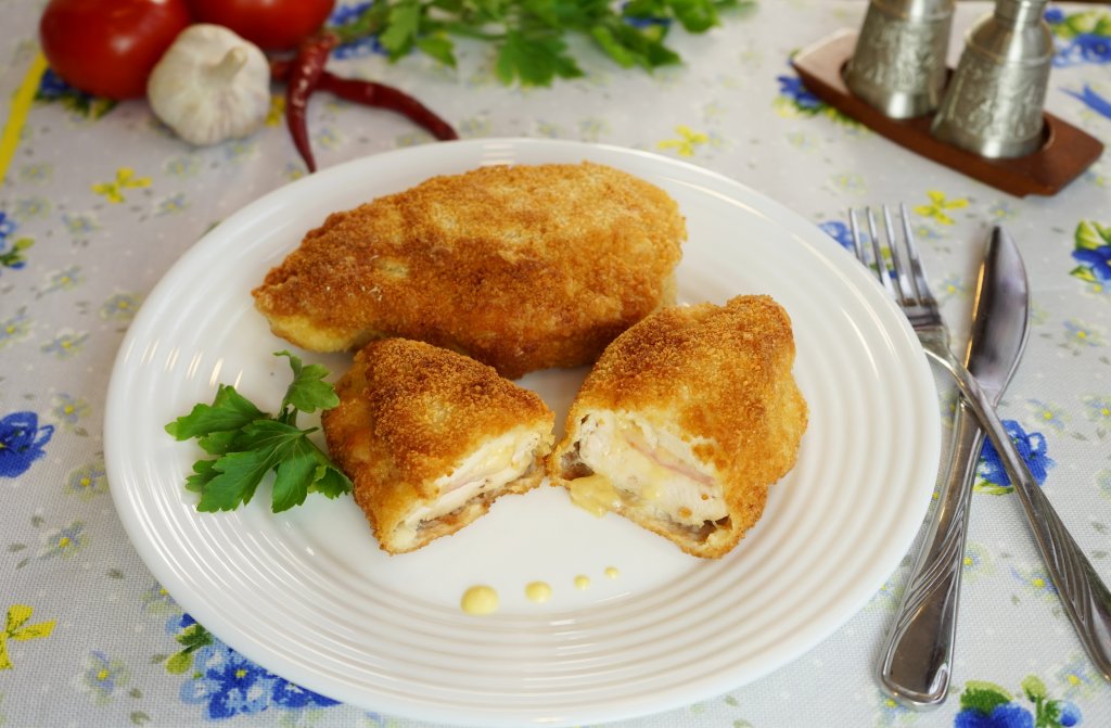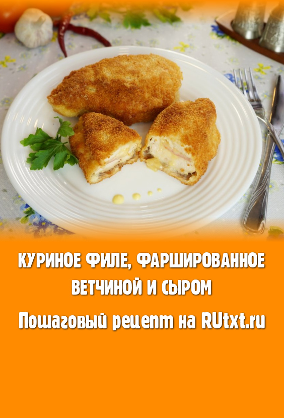 Сочное, аппетитное, ароматное куриное филе, фаршированное ветчиной и сыром, наверняка, порадует вашу семью. Сочетание нежного мяса курицы с тягучим расплавленным сыром - это классика, ветчина добавляет нотку пикантности блюду, а хрустящая, румяная корочка становится тем самым заключительным штрихом. Просто, вкусно и ароматно! Это блюдо прекрасно подойдёт как для уютного ужина в кругу семьи, так и для праздничного стола. На гарнир можно предложить картофельное пюре или овощное рагу.