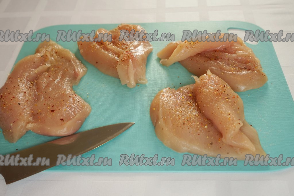 Далее каждую заготовку куриного филе приправляем солью и специями с обеих сторон и отставляем в сторонку, пусть пропитываются ароматами.