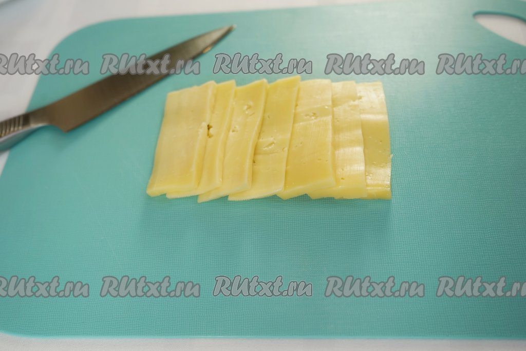 Теперь пришла очередь сыра. В целом, можно использовать любой твёрдый сыр, но особенно вкусно с "Гаудой" или "Голландским" - они отлично плавятся и будут той самой тягучей консистенцией внутри мяса. Нарезаем ломтиками 100 грамм сыра.