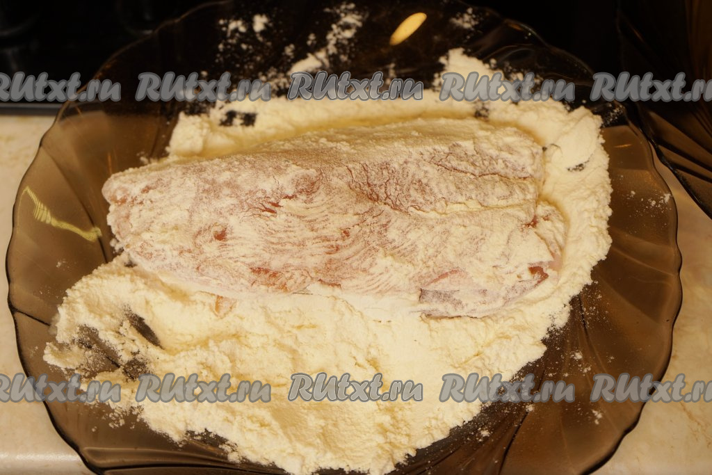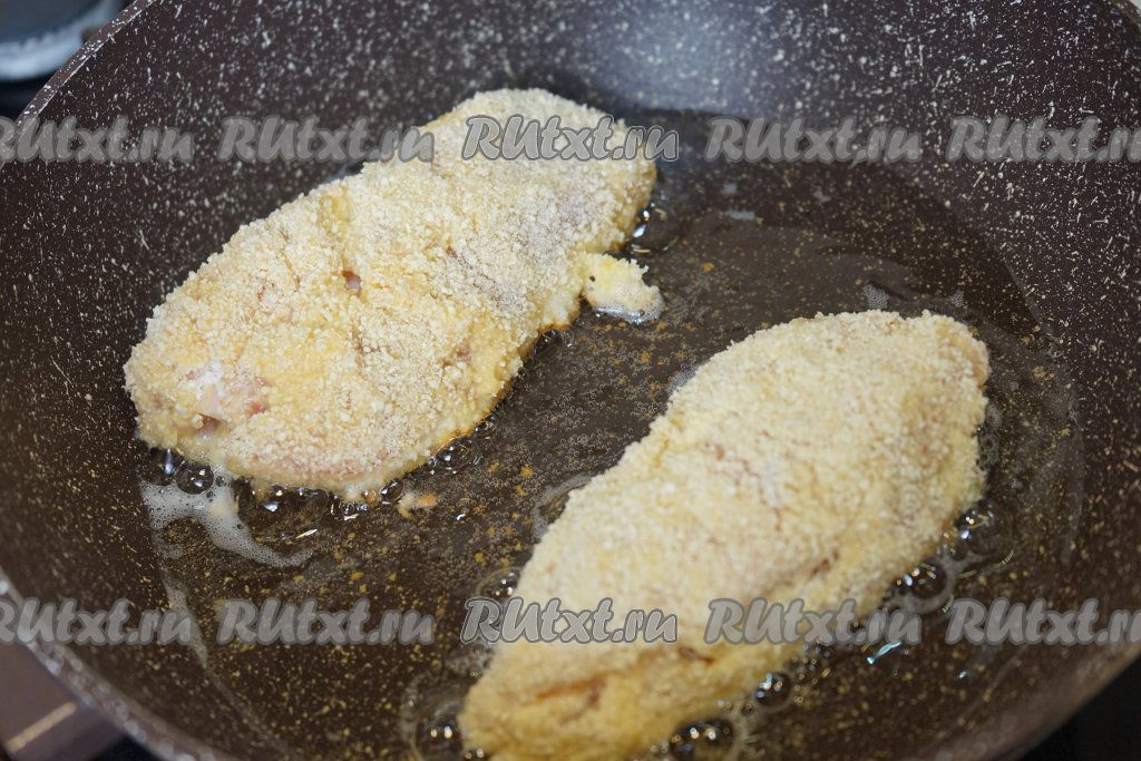 Пока заготовки в морозилке, подготовим глубокие тарелки. В одну насыпаем 150 грамм муки, в другую столько же панировочных сухарей, а в третьей аккуратно взбиваем 2 яйца. Достаём фаршированное куриное филе из морозилки и начинаем обваливать в панировке со всех сторон в следующей последовательности: сначала в муке, затем в яйцах, после этого снова в муке, вновь в яйцах и только после этого в панировочных сухарях. Так наше филе будет иметь плотную, хрустящую панировку, а расплавленный сыр останется внутри блюда.