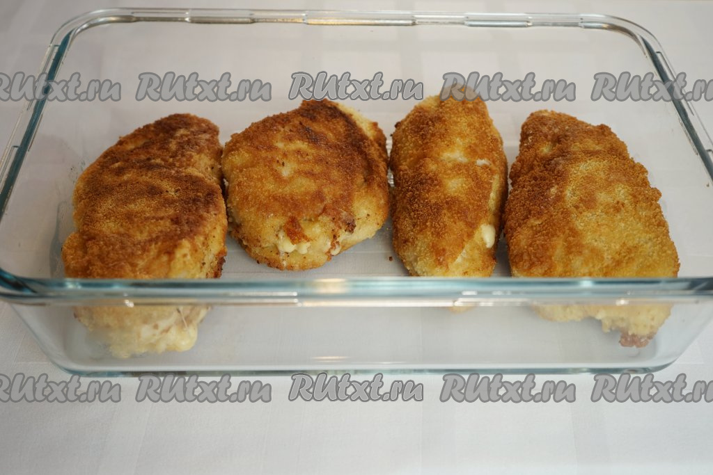 В результате обжаривания у нас получатся аппетитные конвертики из куриного филе с начинкой из ветчины и сыра. Далее перекладываем эти конвертики в форму для запекания и отправляем в предварительно разогретую до 180 градусов духовку, буквально, на 10 минут. Это позволит довести блюдо до готовности. Помните, форму нельзя накрывать крышкой, иначе хрустящая корочка не получится.