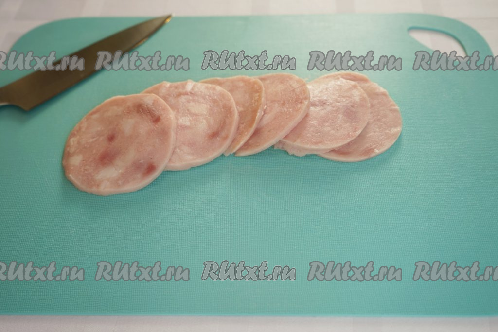 В это время занимаемся начинкой. Берём 100 грамм ветчины и нарезаем ломтиками.