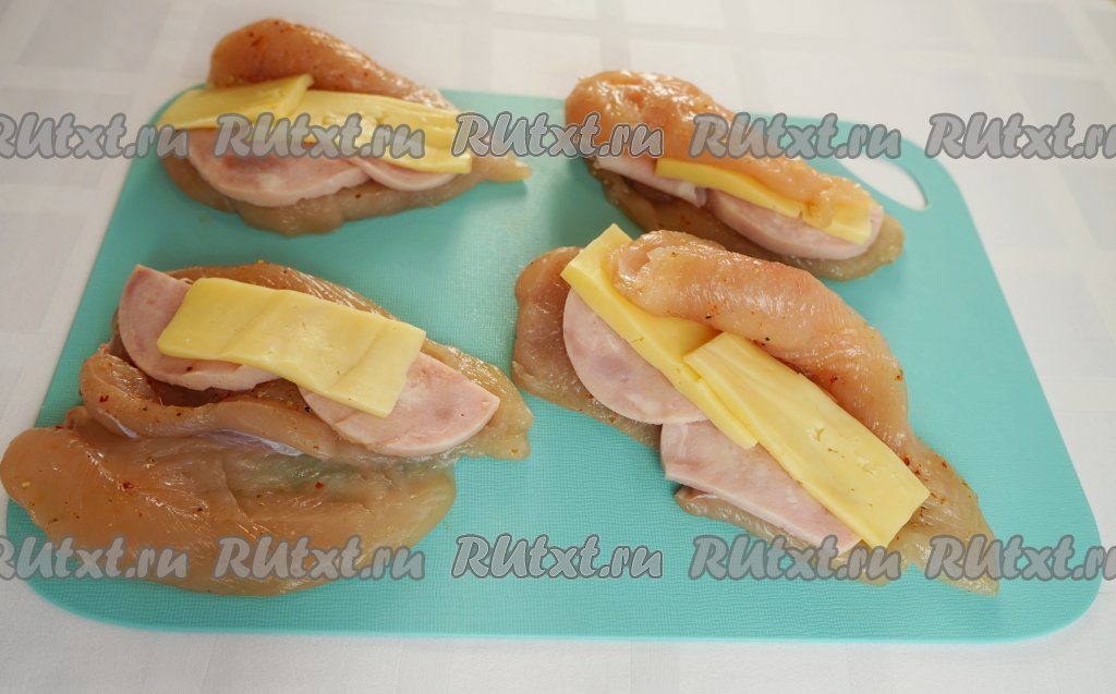 Далее возвращаемся к нашему филе. Начиняем каждый кусочек куриного филе ломтиками ветчины и сыра, стараясь чтобы начинка сильно не выступала за края мяса. При необходимости, обрезаем начинку по форме филе. Теперь самое важное - куриное филе, фаршированное ветчиной и сыром, нужно отправить на 20 минут в морозилку. Замёрзнуть заготовки, конечно, за это время не успеют, но филе схватится с начинкой и жарить его будет гораздо легче, что позволит сохранить блюду форму.