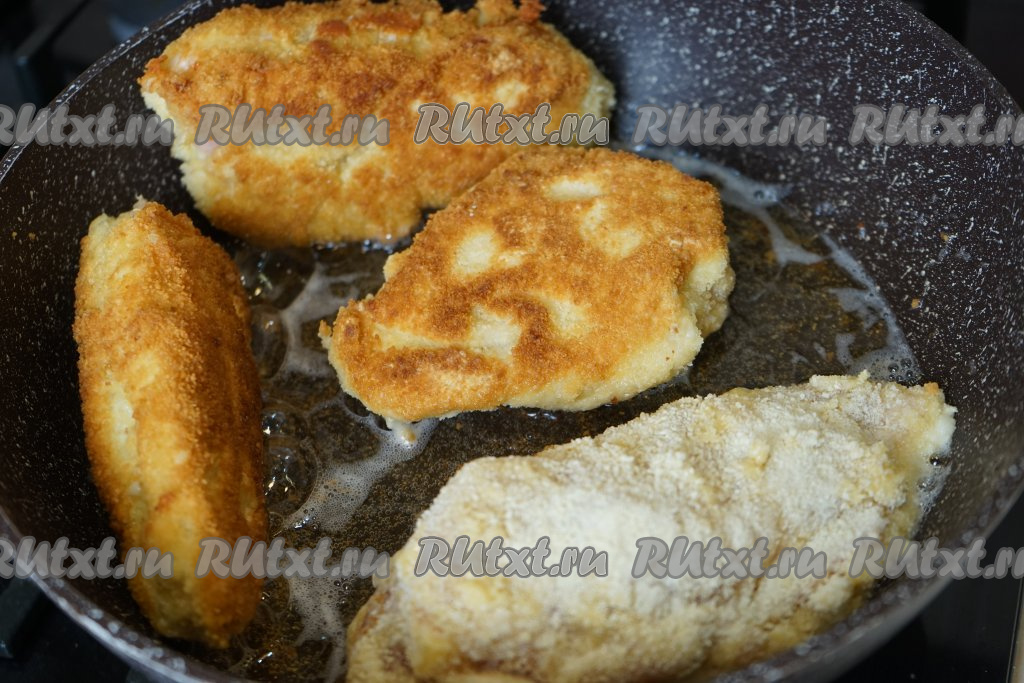Наливаем на раскалённую сковороду 60 мл растительного масла и начинаем обжаривать куриное филе, фаршированное с ветчиной и сыром.
