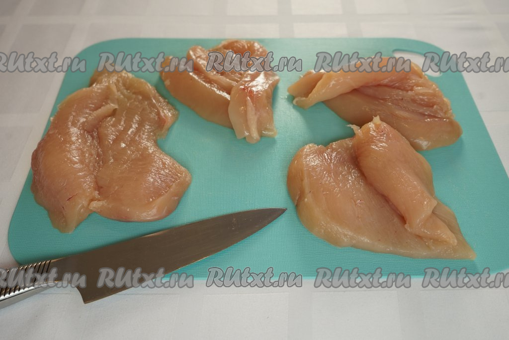 Промываем куриное филе под проточной водой, затем обсушиваем бумажными полотенцами. После этого каждое куриное филе разрезаем на два кусочка. С боку каждого кусочка куриного филе ножом делаем разрез, не дорезая до конца (получится, как книжка). Таким образом из двух куриных филе получатся четыре заготовки.