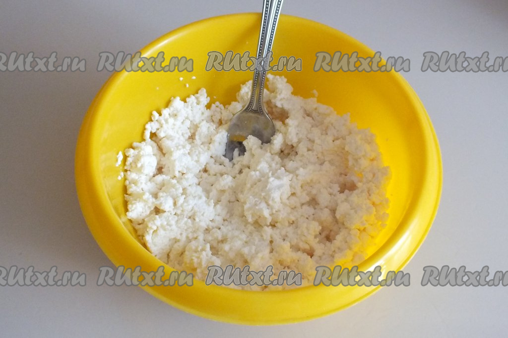 Переложите творог в миску и хорошо разомните его вилкой.