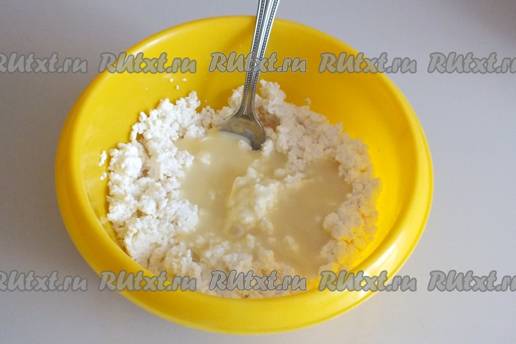К творогу добавьте сгущённое молоко, ещё раз хорошо разомните и перемешайте. Масса должна получиться пластичной, ни в коем случае не жидкой.