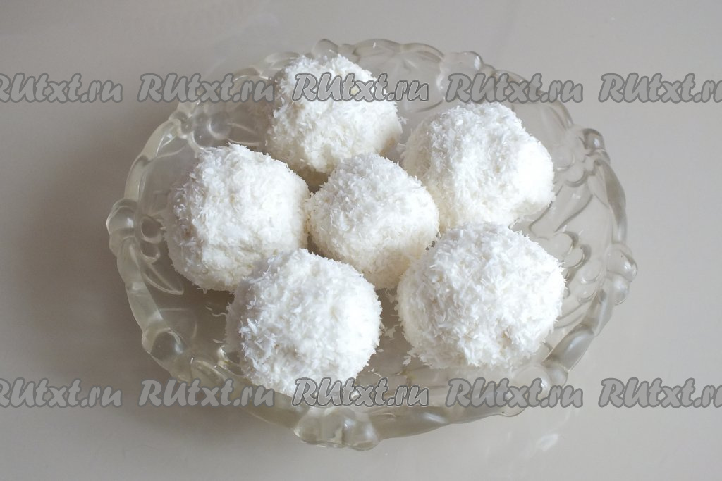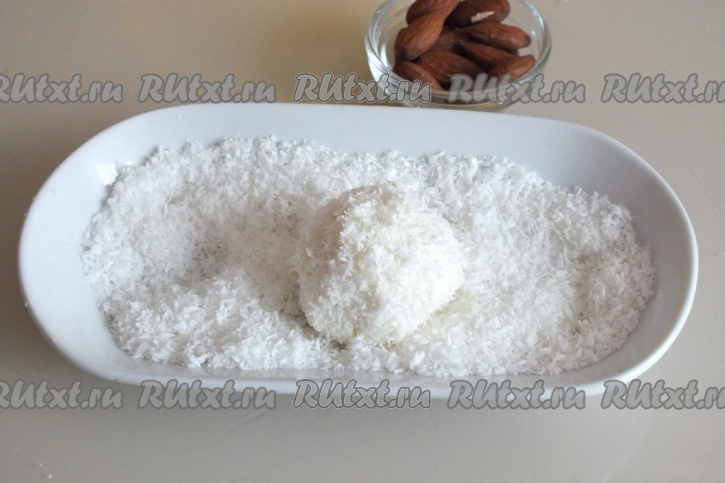 Аккуратно поднимите краешки творожной массы, соедините их, формируя шарик с орешком внутри. Обваляйте творожный шарик в кокосовой стружке со всех сторон.