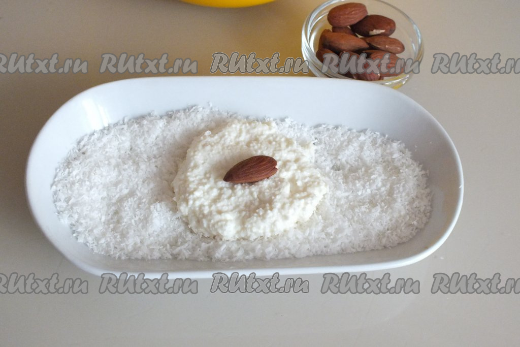 Подготовьте миндаль. Важно, чтобы он не был горьким. В тарелочку насыпьте кокосовую стружку. Зачерпните столовой ложкой творожную массу, выложите её на кокосовую стружку. Немного прижмите творожную массу, чтобы получилась лепёшка. На серединку творожной "лепёшки" положите миндаль.