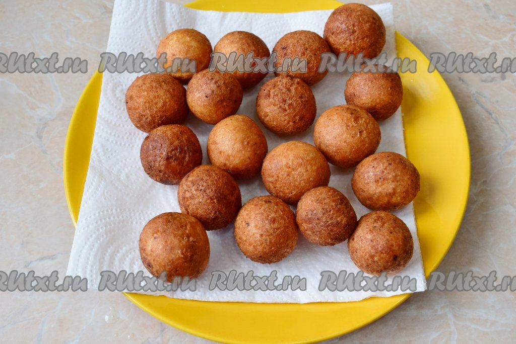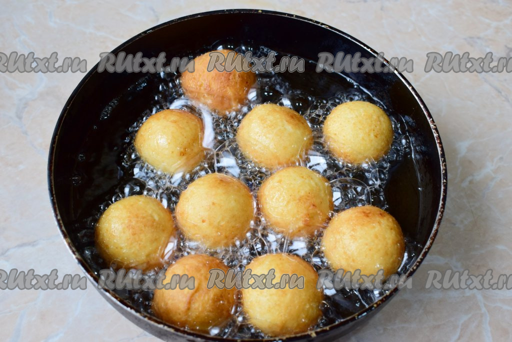 Руки немного смажьте растительным маслом, отщипывайте немного теста и скатывайте небольшие шарики. В глубокой сковороде очень хорошо разогрейте растительное масло. Опускайте шарики в горячее масло и жарьте их на среднем огне 3-4 минуты, периодически переворачивая со стороны на сторону.