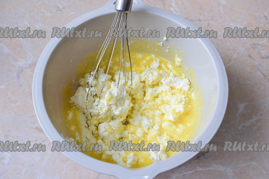 Затем добавьте в чашу мягкий, влажный творог. Если творог неоднородный, то протрите его через сито. Вмешайте творог в яичную массу.