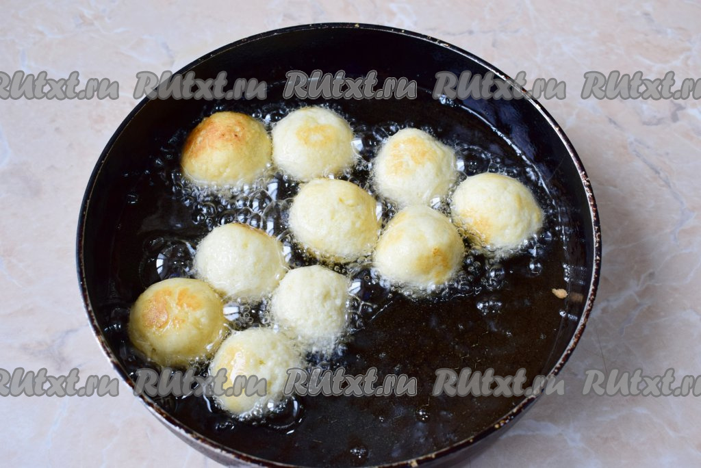 Во время жарки творожные шарики увеличатся в размере и будут становиться золотистого цвета. Большой огонь делать не надо, чтобы они успели прожариться внутри.
