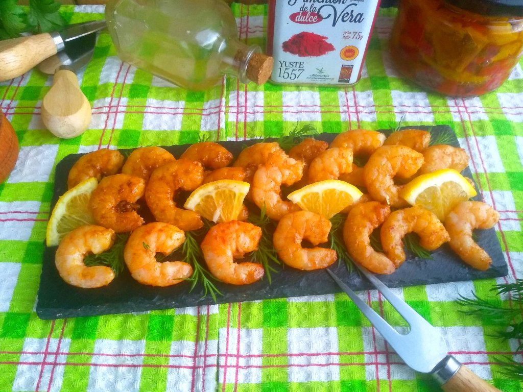 Переложить креветки на тарелку для подачи, украсить зеленью и лимонными дольками. Аппетитные, вкусные, ароматные жареные королевские креветки в соевом соусе с чесноком готовы, их можно подать в качестве закуски к белому вину или пиву.