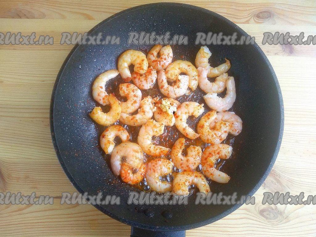 Зубчики чеснока пропустить через пресс (или натереть на средней тёрке). Перевернуть креветки, выложить подготовленный чеснок, добавить специи по вкусу. Продолжать готовить около 1-2 минут. Недожаренные креветки имеют вытянутую форму, пережаренные экземпляры сворачиваются в кружок. Идеально жареная креветка должна быть, как буква «С». Общее время термообработки морепродуктов не должно превышать 5 минут.