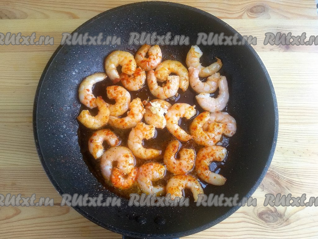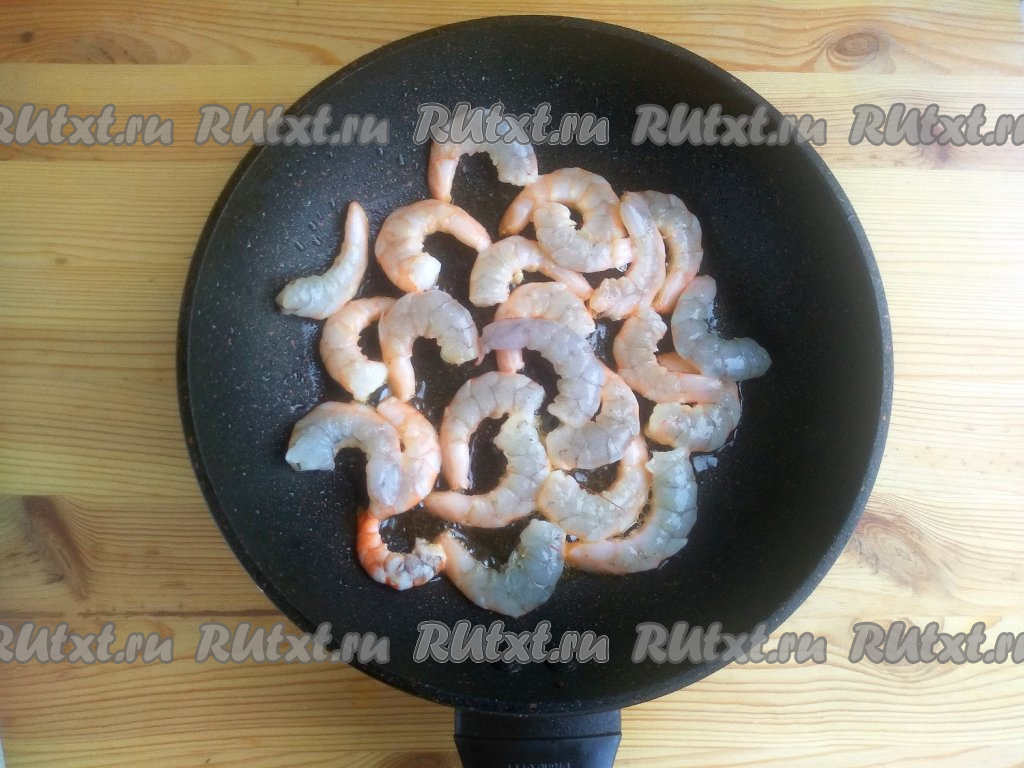 Сковороду с растительным маслом разогреть, выложить королевские креветки в один слой. Обжаривать их в течение 1,5 минут на среднем огне (до розового цвета).