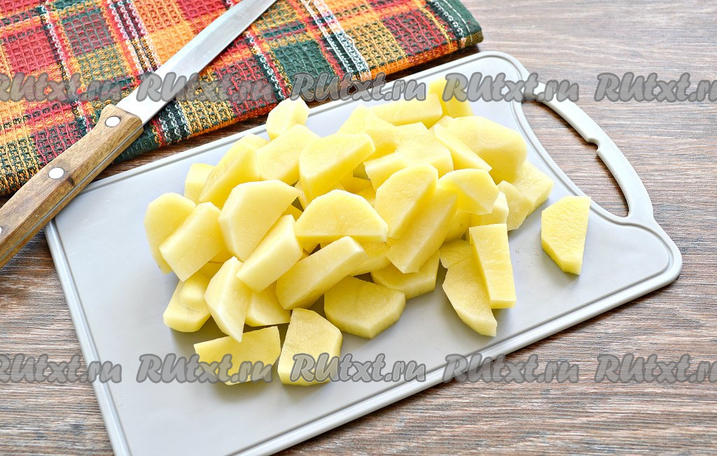 Очистить картофель. Ополоснуть клубни под холодной водой и нарезать средними брусками. Когда капуста проварится минут 10, выложить в кастрюлю картошку и варить ещё 7-10 минут.