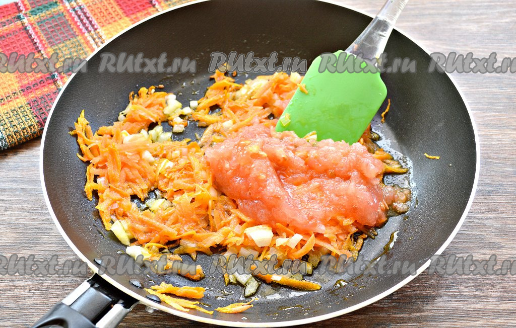 Натереть вымытый помидор на тёрке (стараемся натирать помидор без шкурки), а затем добавить к обжаренным овощам, перемешать. Тушить лук, морковку и томат на небольшом огне минут 5, иногда помешивая.