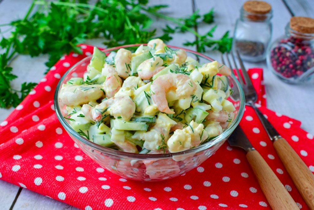 Вкусный, сочный, сытный салат, приготовленный из креветок с добавлением свежего огурца и варёных яиц, отлично впишется и в повседневное, и в праздничное меню, попробуйте!