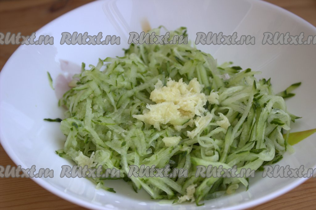 Огурцы помыть, натереть на тёрке среднего размера, выложить в миску, посолить и дать постоять минут 10, чтобы огурчики дали сок.