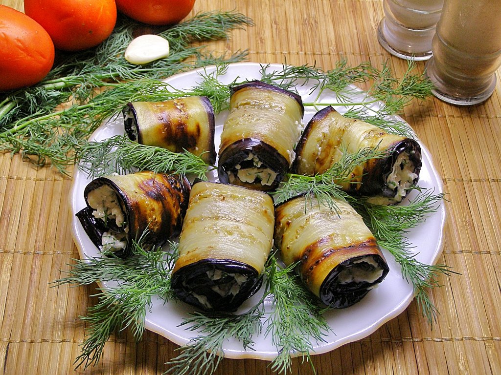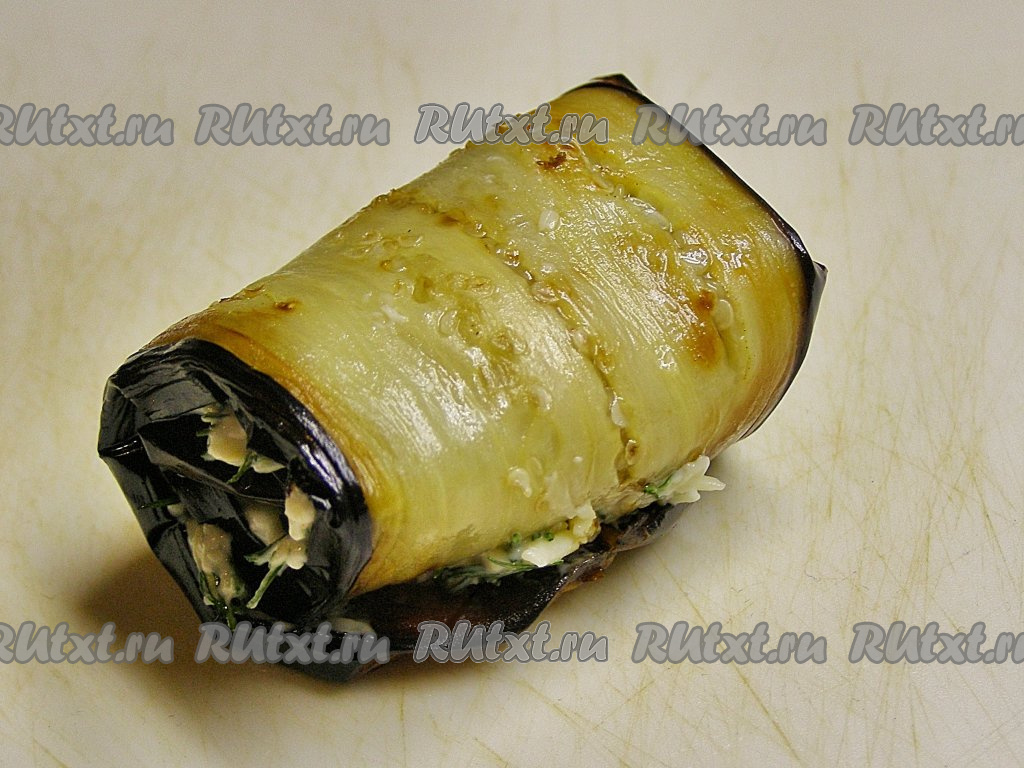 Сворачиваем пластину жареного баклажана с начинкой из сыра, укропа и чеснока в рулет. Так формируем все рулетики. Убираем приготовленные рулетики в холодильник, примерно, на 30 минут.