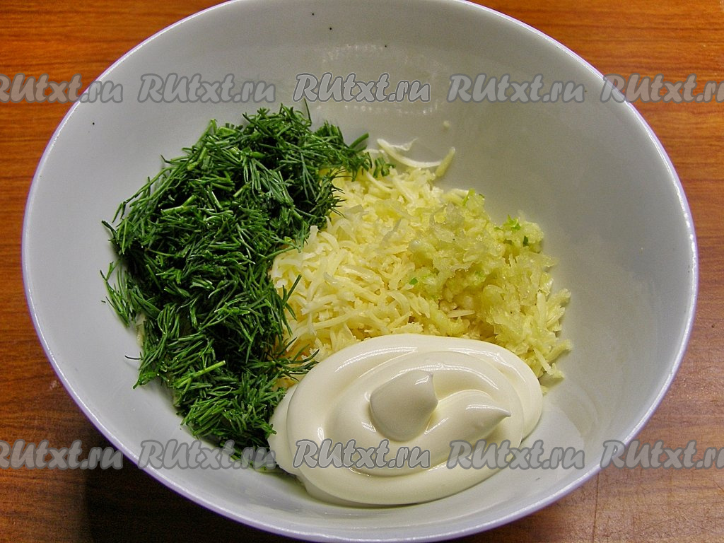 Укроп моем, просушиваем и мелко режем. Перекладываем сыр и укроп в миску, добавляем майонез и пропущенные через пресс зубчики чеснока, перемешиваем получившуюся сырно-чесночную начинку для баклажанов до однородного состояния, по вкусу можно слегка посолить.