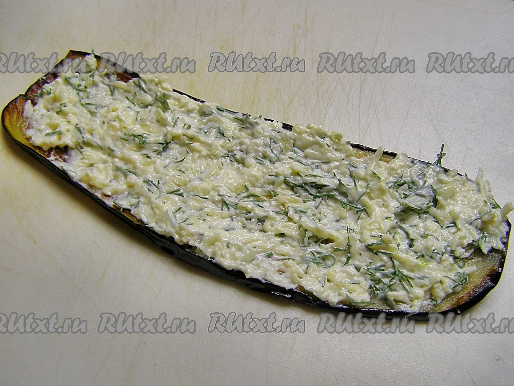 Каждую пластинку остывшего баклажана смазываем подготовленной сырно-чесночной начинкой.