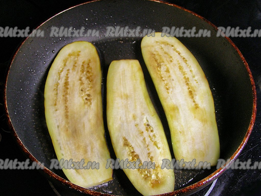 Через 10 минут ополаскиваем пластинки баклажанов прохладной водой и просушиваем на бумажном полотенце. В сковороде разогреваем растительное масло на сильном огне, уменьшаем огонь до среднего, выкладываем пластинки баклажанов и обжариваем их до золотисто-коричневого цвета с двух сторон.