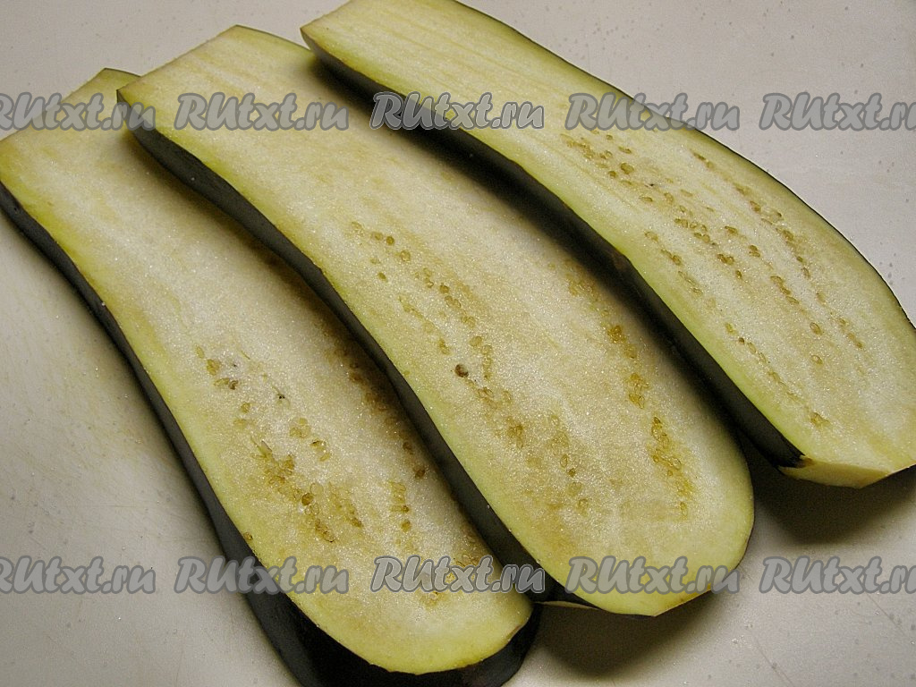 Баклажан моем, отрезаем от него плодоножку и нарезаем вдоль на пластинки толщиной около 5 мм. У меня получилось 6 пластинок. Нарезанные пластинки посыпаем с обеих сторон солью и оставляем минут на 10, чтобы вышла горечь.
