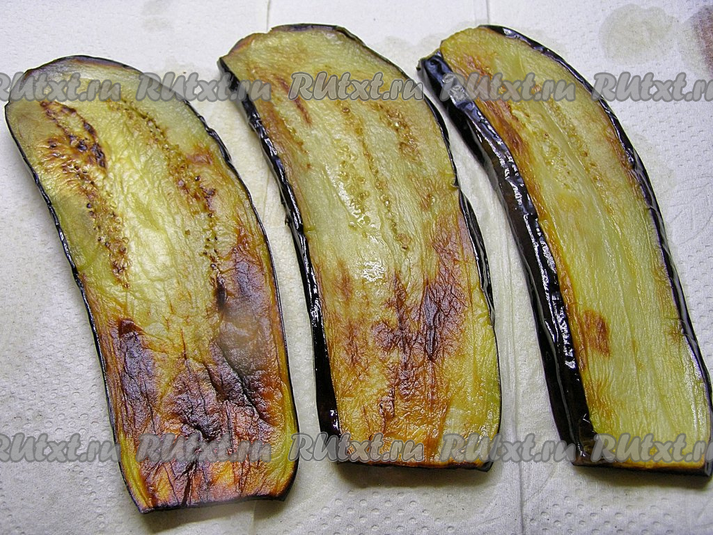 Обжаренные баклажаны перекладываем на бумажные полотенца, чтобы избавиться от лишнего масла, и оставляем остывать. Аналогично обжариваем оставшиеся пластины баклажанов.