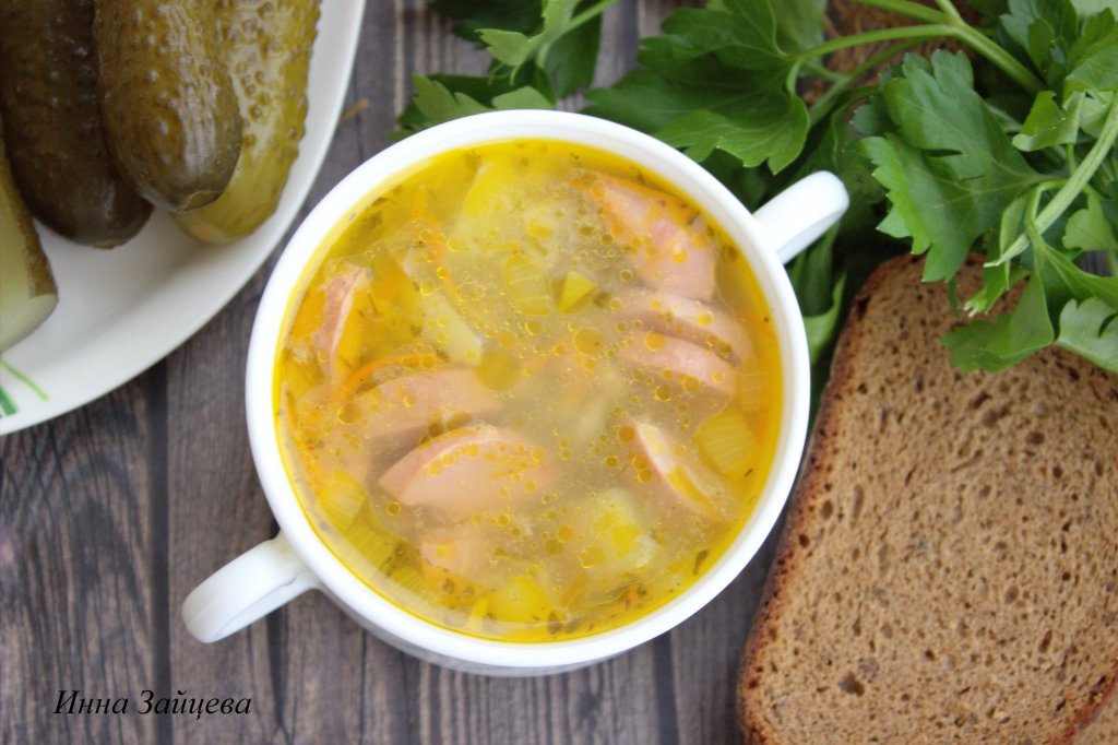 Сегодня предлагаю сварить отличное первое блюдо - рассольник с сосисками и солёными огурцами. Этот супчик можно готовить на воде, а для сытности и густоты в него можно добавить перловку или рис, хотя и без добавления круп тоже будет вкусно и достаточно сытно. Такое первое блюдо можно приготовить, когда у вас дома нет мяса для варки бульона, но при этом хочется накормить всю семью сытным, аппетитным супчиком.