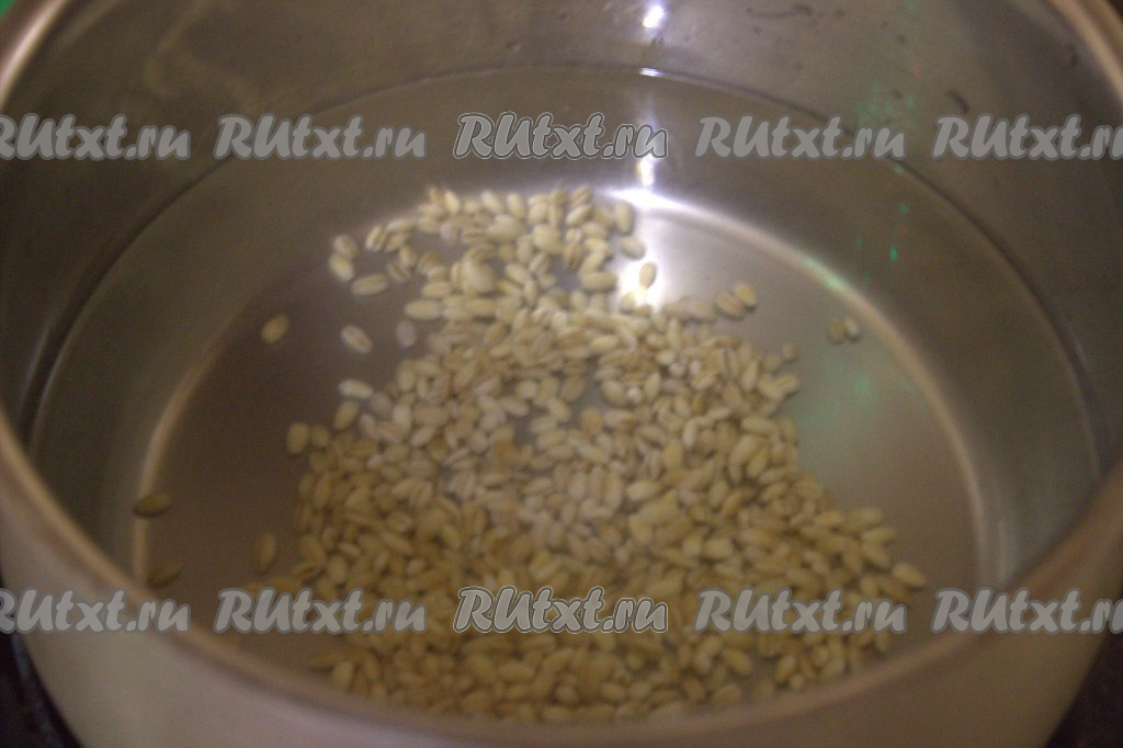 Я для сытности в рассольник добавила перловку, но если у вас её нет или вы не любитель этой крупы, то можете этот шаг пропустить и просто вскипятить в кастрюле 2,5-3 литра воды. Если же вы будете готовить с перловкой, тогда нужно хорошо промыть крупу под проточной водой, залить полностью холодной водой и оставить для набухания (лучше всего оставить для набухания на ночь, но если время не позволяет, оставьте на 40-50 минут). Набухшую перловку нужно хорошо промыть под проточной водой, переложить в кастрюлю, влить к крупе 2,5-3 литра чистой холодной воды и поставить на огонь. Варить перловку после закипания воды 15-20 минут на небольшом огне.