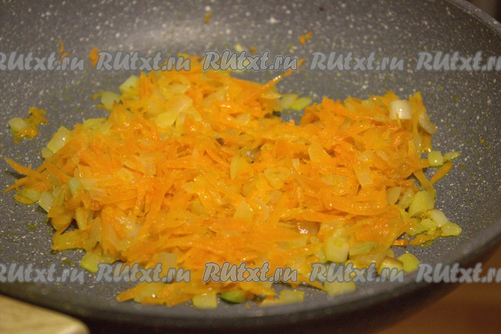 В сковороду влить растительное масло, выложить лук и обжарить его на среднем огне, помешивая, до прозрачности (примерно, 3-5 минут). Затем добавить в сковороду морковь и обжарить овощи в течение 5 минут, помешивая.