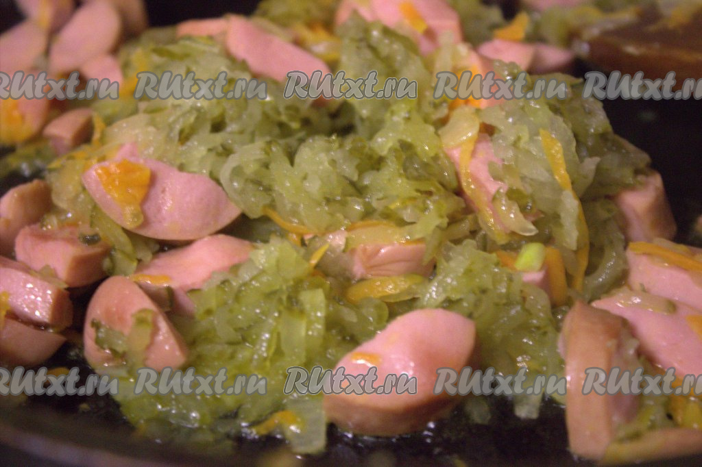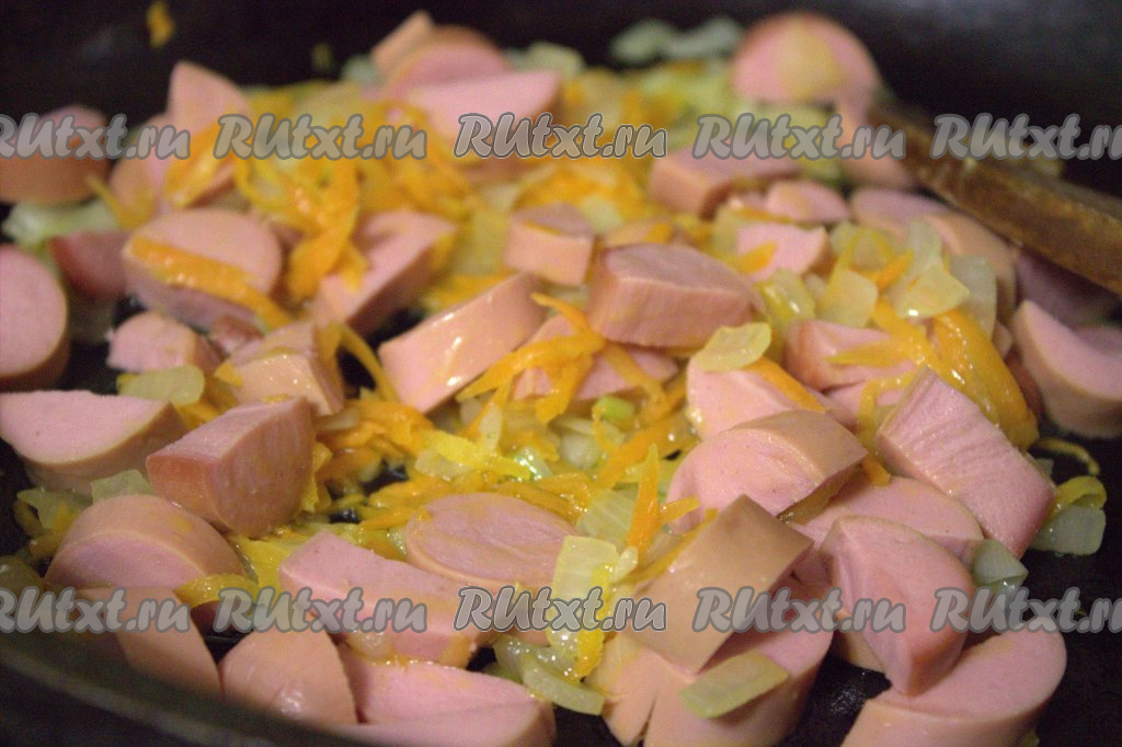 Очистить от плёнки, произвольно нарезать сосиски и добавить в сковороду к обжаренным овощам. Обжаривать сосиски с луком и морковью, помешивая, 5-7 минут.