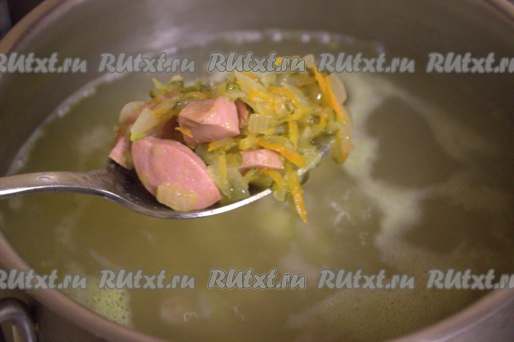 После того как картофель с перловкой станут мягкими (будут полностью готовы), переложить в кастрюлю обжаренные овощи с сосисками.