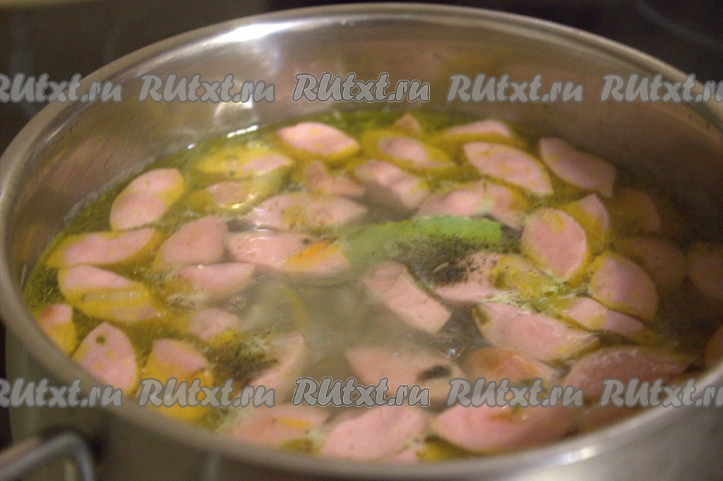 В рассольник с сосисками и солёными огурцами добавить лавровый лист, специи, при необходимости, присолить, довести до кипения и, уменьшив огонь, варить минут 10. Затем убрать с огня и дать настояться блюду под крышкой 10 минут.