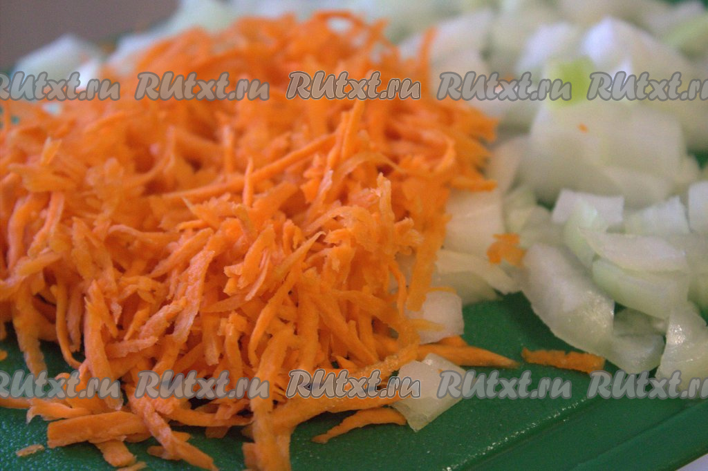 Очистить луковицу, а затем нарезать на небольшие кубики. Морковку нужно натереть на тёрке среднего размера.