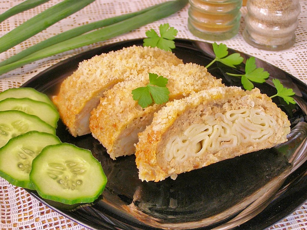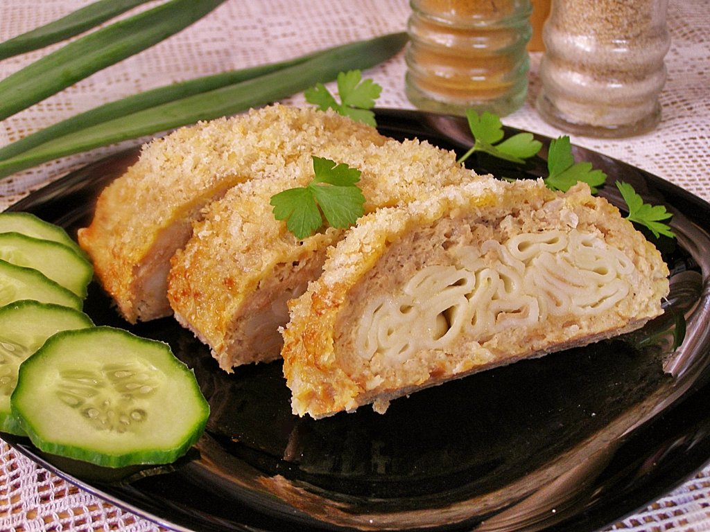 Аппетитный, сочный и сытный рулет, приготовленный из фарша с макаронами, достаём из духовки, даём немного остыть, нарезаем на порции и подаём к столу в горячем виде в качестве основного блюда, дополнив, по желанию, лёгким овощным салатом, или даём полностью остыть и подаём в качестве закуски.