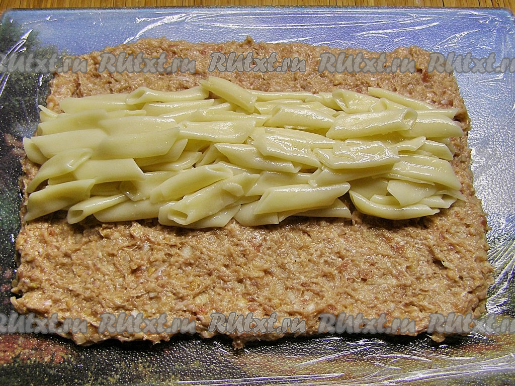 В середину прямоугольника из фарша выкладываем остывшие макароны.